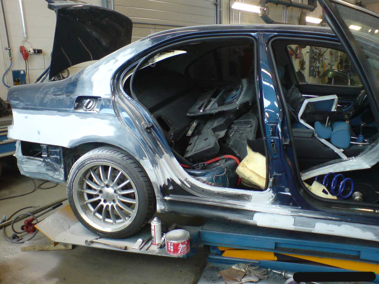 20.2.2009 Sain vihdoin auton robottiin ja pikkuhiljaa vetotöitä aloittamaan. Tärkeimmät "korjaukset" on tietysti jo tässä vaiheessa tehty,eli vanteet, valot ja alusta päivitetty. =) E39 kiinnitetään robottiin omilla kiinnikkeillään jotka tulevat tunkin nostokumien paikalle. Ihan kätevä systeemi.